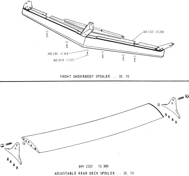 Two other spoilers were offered on AMXs and Javelins but they were not Group 19 parts. A stainless steel front spoiler (899 2553) was available on 1968-'70 AMXS and Javelins as an accessory. The Mark Donohue spoiler was used on 1970 Javelins only and was a regular part. A roof spoiler was also available on the 1969-'70 Javelin only as a regular part.