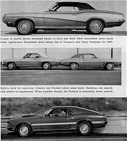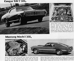 Trying to figure out what combination you can get, or is available, might seem like it will take the machinations of an IBM 360, but it's a good way to spend a rainy Saturday afternoon. Cars in the sporty group have more engine options than most, and a comparison of the '68 offerings with the '69 looks like a change of administration at the White House. Some have been axed and others added. Of significance is the addition of Ford's all new 351 cubic inch engine to both the Mustang and Cougar lines. Its light weight aids handling, but with a four-barrel carburetor and 290 horsepower, it can really move both cars along. Both cars have also been complemented with the big 428 cobra jet engine. Mercury has dropped the 302 inch V-8, making the 351 the base engine in the Cougar line.