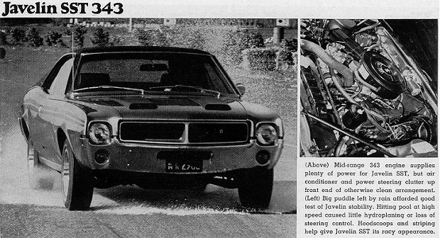 Lightest in weight and with the lowest axle ratio, the Javelin was in the same ball park as the Mach I in acceleration, even though it, too, gave away ten horsepower to the Mach 1. Shifting the Javelin with the new Hurst shifter is, if anything, even more of a kick than in the Camaro. Unfortunately there was a lot of transmission and throw-out bearing noise inside the Javelin. We couldn't tell if this was symptomatic of all or just with our car as it was one of the first off the line. If you like the feeling and sound of a race car, you may dig it.