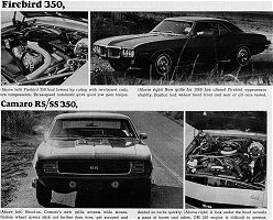 Our Camaro was much better equipped than the Firebird 350, which had only a speedometer and idiot lights. Just the barest necessities. A good girl car. In fact, when our secretary took it home one night she fell in love with it. It didn't have all those silly gauges to check. Just put it in Drive and go. The Chevrolet men still insist on putting the fuel, amps, water temperature and oil pressure gauges down on the console where you can't see them without taking your eyes completely off the road. And they still reflect sunlight. The dash has been completely redesigned this year, with tach and speeds canted inward with a small clock in the center. They've also added imitation wood ; and it looks imitation. In deference to the Camaro's performance, we must say it had all the power options : brakes, stearing, windows, plus air conditioning. An unusual coincidence made itself apparent whenever we took sharp turns at speed : our left knee, resting on the door panel was at the exact height as the power window switches and with the pressure of the turn kept lowering the window in our door. Even changing position, our knee ended up in the same spot and zip-down went the window.