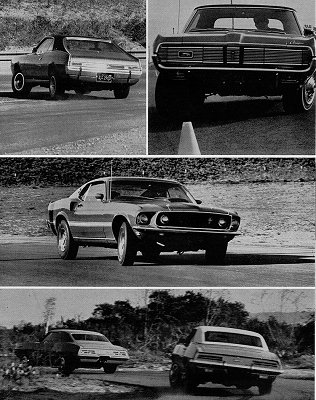 The Ford boys have done it again. Their cars handle impeccably. Even the Cougar. It was barely a sporty car in length before. In '69, although it still retains a lll.l-inch wheel- base, they've added three inches to the overall length. No matter. Handling hasn't been affected in the least. The cars are quite similar, but the Mach I has a slight edge. Both cars go through corners flat and smooth. No rolling, no pitching. Push them as hard as you want ; they're predictable. Understeer is slight. No manufacturer wants neutral steering in his car but the Cougar comes close to it. Drift through a corner in either car. A little steering wheel, a little throttle and you power through. They go where you put them and they stay there. No wild afterthoughts ; you're in control. Power steering is also excellent in both cars. You have more wheel turns, lock- to-lock than the GM cars, but steering on the Fords has a little force behind it, a strong, heavy feel that gives you some message of what's happening with the front end. Both the Mach I and Cougar are equally at home on a winding road or on a sharp turn road course.
