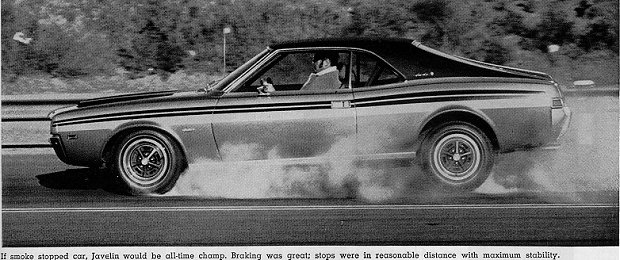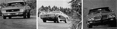 All the cars stopped straight and true without any uncontrollable swerve except the Camaro. Even with front disc brakes the Camaro had a tendency to pull to the right and then get a little rear end heavy from side to side. We were impressed by the great stability of the Firebird with drum brakes all around. Panic stops from both 30 and 60 mph were both flat and constant. Stopping from 60 mph took a little more room but there was no lateral motion. Javelin's constant and invariable stops also rate high. The big E70 tires put a big footprint on the asphalt. Although they smoked like crazy there was no deviation from the straight.