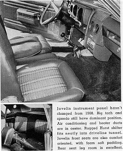 After the Mach 1, the Javelin is probably the most comfortable for sitting and driving, With American Motors' famous adjustable slotbacks you can get more variations of driving positions than with any of the other cars. The Javelin buckets adjust farther back than any except the Mach I. A good option that our car had is a fold down center armrest between the bucket seats. When it's up, three people can sit comfortably in front because of the absence of a console. Folded down, the armrest is just the right height for comfortable highway cruising and is generously padded. Javelin head restraints are also the most softly padded in case your head is ever snapped back unexpectedly. With the special suspension, ride is a little harsh on the Javelin, but it seems to be part of the car. You sort of expect it as part of the no nonsense impression it gives.