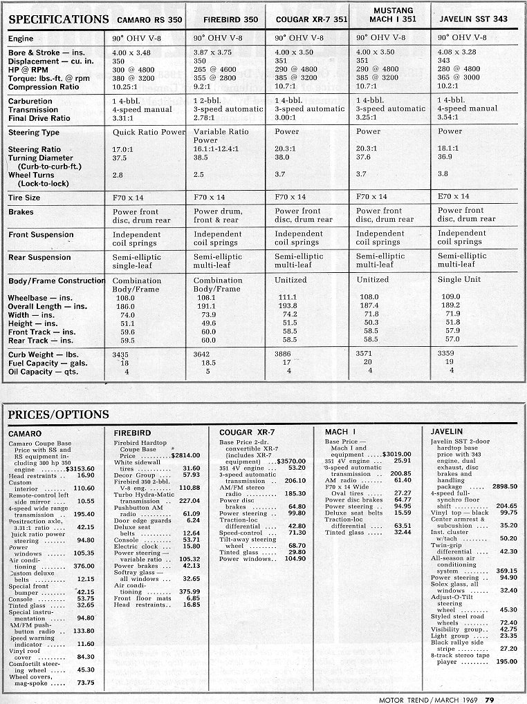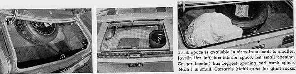 Inside door handles are difficult to reach on both the GM cars as they are under the door armrests. Ford puts the handles inside the armrests, but on top, making the doors easy to open. Inside handles on the Javelin are in front of the armrests and while somewhat difficult to operate, are better than GM's. Trunk openings on the Camaro, Firebird and especially the Mach 1 are small. Cougar has the biggest trunk opening and the biggest interior room, followed by the Javelin. But, none of the five have trunk space to carry any great amount of luggage.