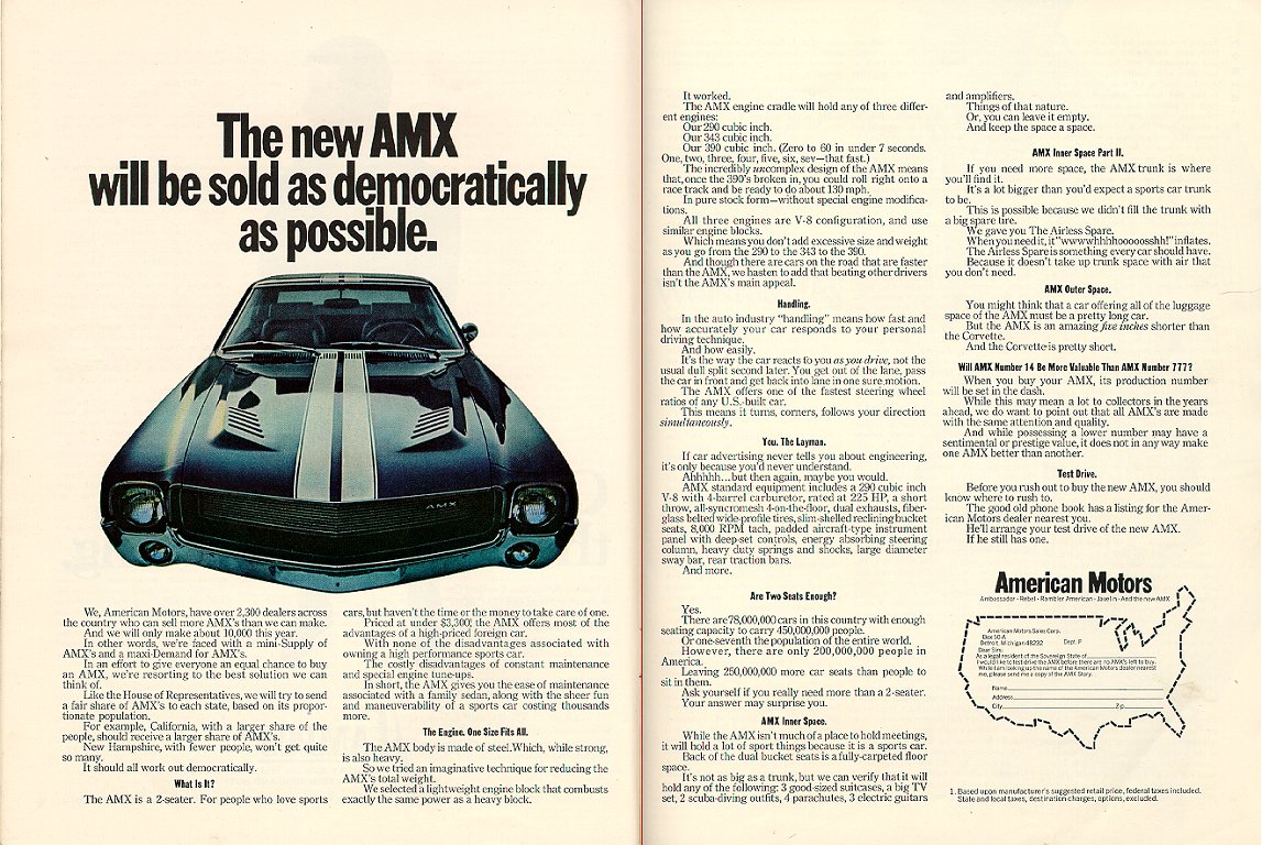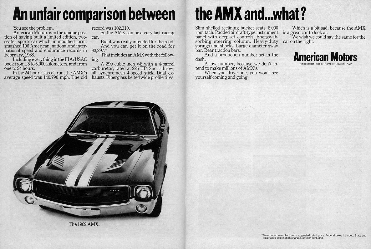 June 1969, Motor Trend magazine, 'American Motors comes up with an amidship beauty': AMX/2 feature.
